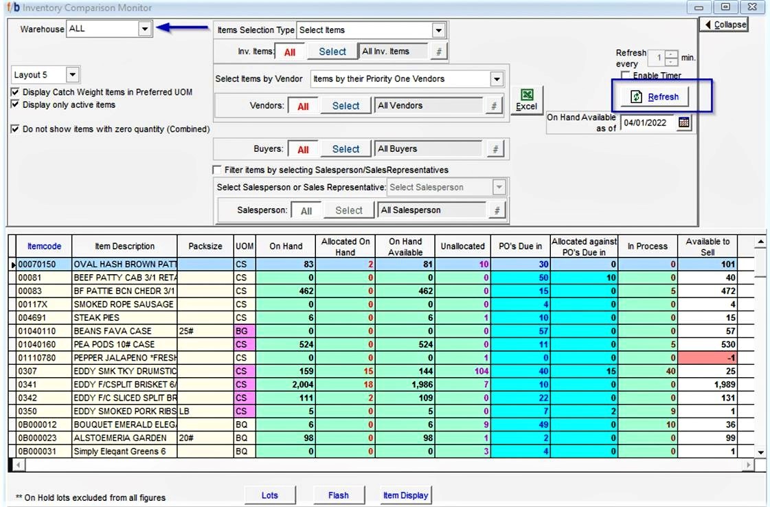 The Inventory Comparison Monitor Screen provides an overview of Inventory Items with Real-Time status updates