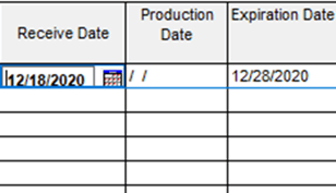 Calendar options have been added to the lines on the Receiving (Inventory) screen for the Received Date, Production Date, and Expiration Date. While in EDIT mode, the calendar will appear once the field is selected