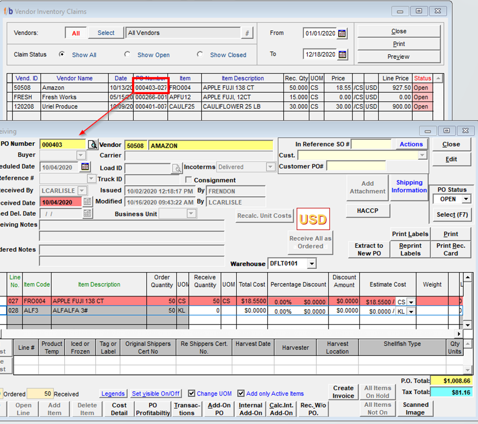 An item can be marked as a Claim at the time of receiving in order to track the status of a claim with the Vendor. All items marked as Claim may be viewed on the Inventory Claims screen. This screen shows the status of each claim. The User can now double left click on the PO number, from this screen, and be redirected to the PO Receiving screen. This feature is available for both Open and Closed claims.