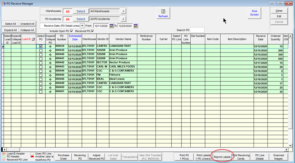 The Inventory Receiving Manager is the control center for all things Receiving. Now the User can Reprint Labels just as they can from the PO Receiving Screen. This option becomes available when a Purchase Order is selected.