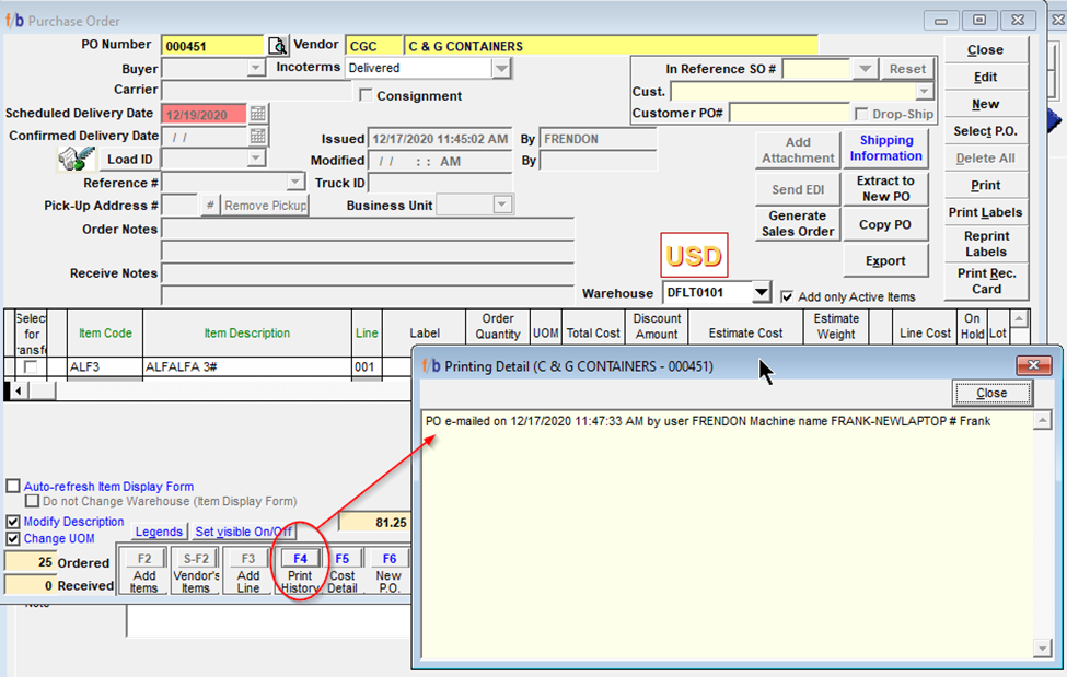 The purchase order has an option to view the print history. An additional feature has been added to record the emailing of the purchase order as well, in the print history screen. Once a purchase order has been emailed, select the Print History (F4) to see the date and time the email was sent as well as the User who initiated the email.