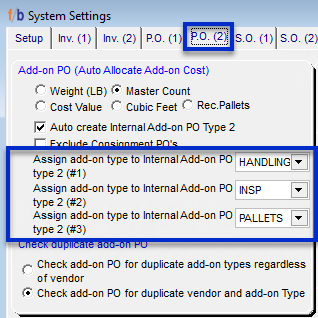 In System Settings -> PO (2), the User may assign the Add-on PO types. The selections will display on the Item Master.